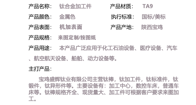 宝鸡盛辉钛业有限公司主营钛棒,钛加工件,钛标准件,钛锻件,钛异