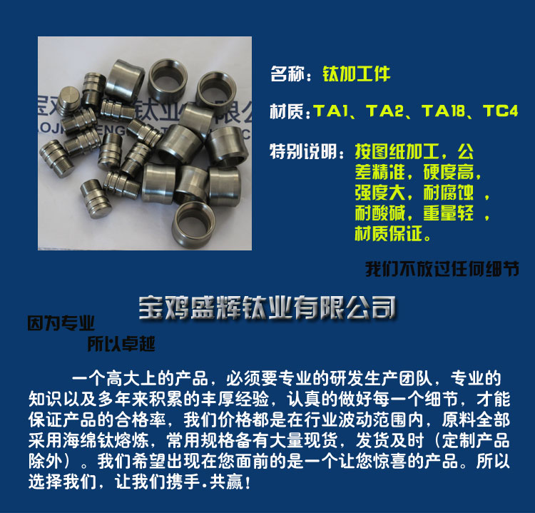 宝鸡盛辉钛业有限公司是一家主要从事钛及钛合金棒,钛环,钛法兰及钛合金板材的高新技术企业,公司提供钛环,钛合金棒批发,钛环的生产工艺服务,以人为本,质量取胜为宗旨:18791863990,18740375975