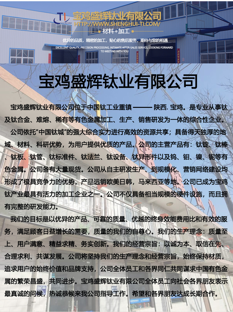 宝鸡盛辉钛业有限公司是一家主要从事钛及钛合金棒,钛环,钛法兰及钛合金板材的高新技术企业,公司提供钛环,钛合金棒批发,钛环的生产工艺服务,以人为本,质量取胜为宗旨:18791863990,18740375975