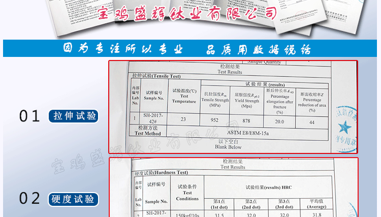 为了帮助客户辨别钛商品的品质优劣,确保钛产品的来源渠道正规,本公司可提供第三方检测机构证明书。客户可以清楚的知道商品的的名称、材质、批号、成分等详细信息。确保钛产品的优良品质。