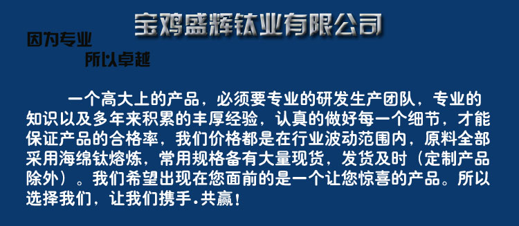 宝鸡盛辉钛业有限公司是一家主要从事钛及钛合金棒,钛环,钛法兰及钛合金板材的高新技术企业,公司提供钛环,钛合金棒批发,钛环的生产工艺服务,以人为本,质量取胜为宗旨:18791863990,18740375975