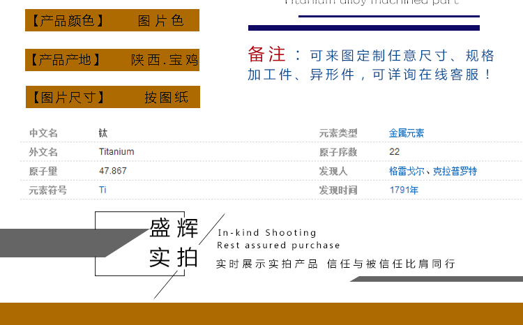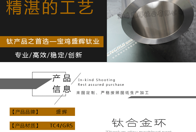 宝鸡盛辉钛业专业生产销售各种规格的钛棒,钛加工件,各类钛标准件,钛锻件,钛异形件等。主要设备有:加工中心,数控车床,普通车床等。设备齐全,生产能力强,可根据客户要求来图加工。