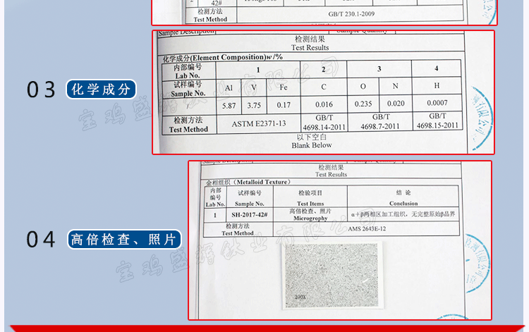 为了帮助客户辨别钛商品的品质优劣,确保钛产品的来源渠道正规,本公司可提供第三方检测机构证明书。客户可以清楚的知道商品的的名称、材质、批号、成分等详细信息。确保钛产品的优良品质。